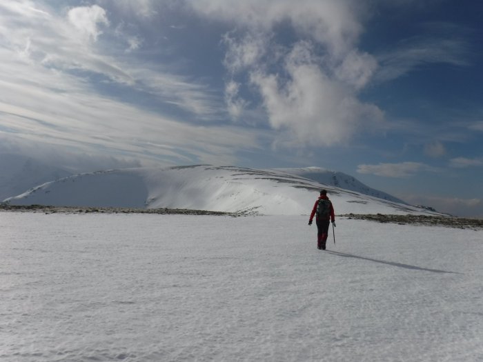 Blethers were keenly exchanged as they all headed east up the burnside before Lorn broke off to tackle the south-west ridge of Creag Pitridh. The snow was a joy to walk on, being firm enough to support the weight of even the less svelte-like members of the party. After several hums and an equal number of haws, and having tramped a further kilometre towards the bealach, George and Susan decided that they would take advantage of the favourable underfoot conditions and add Beinn a Chlachair to their day.