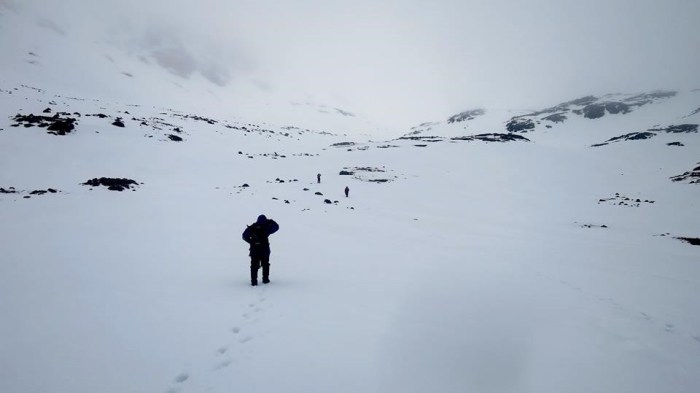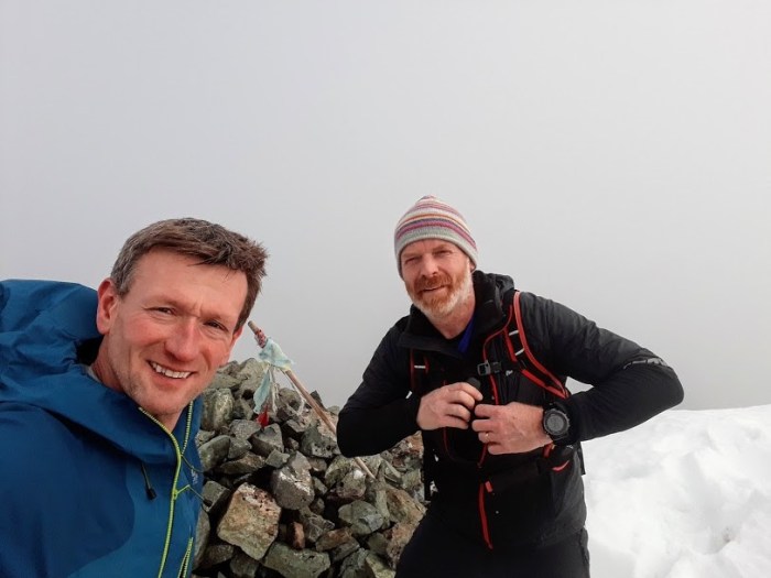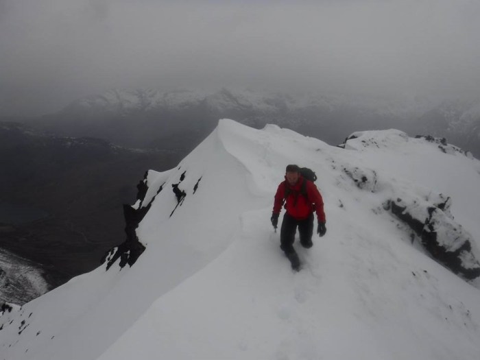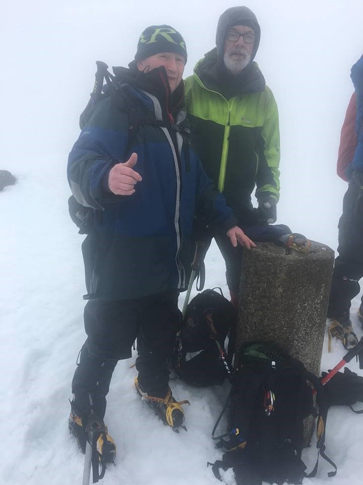 Alan Orr, Gerry Weir, Jim Hughes, and JDF decided to climb Bruach na Frithe, possibly one of the easier summits but in full winter conditions this was to be no walk in the park. Deep packed snow and whiteout conditions started to have its effect on some of the team who when on the ridge threatened to call it a day but after some reassurance all pulled together to reach the summit. Gerry’s first time on Skye and another tick for Alan. Huge bum slides made the descent easier. Another first for Gerry.