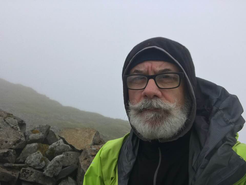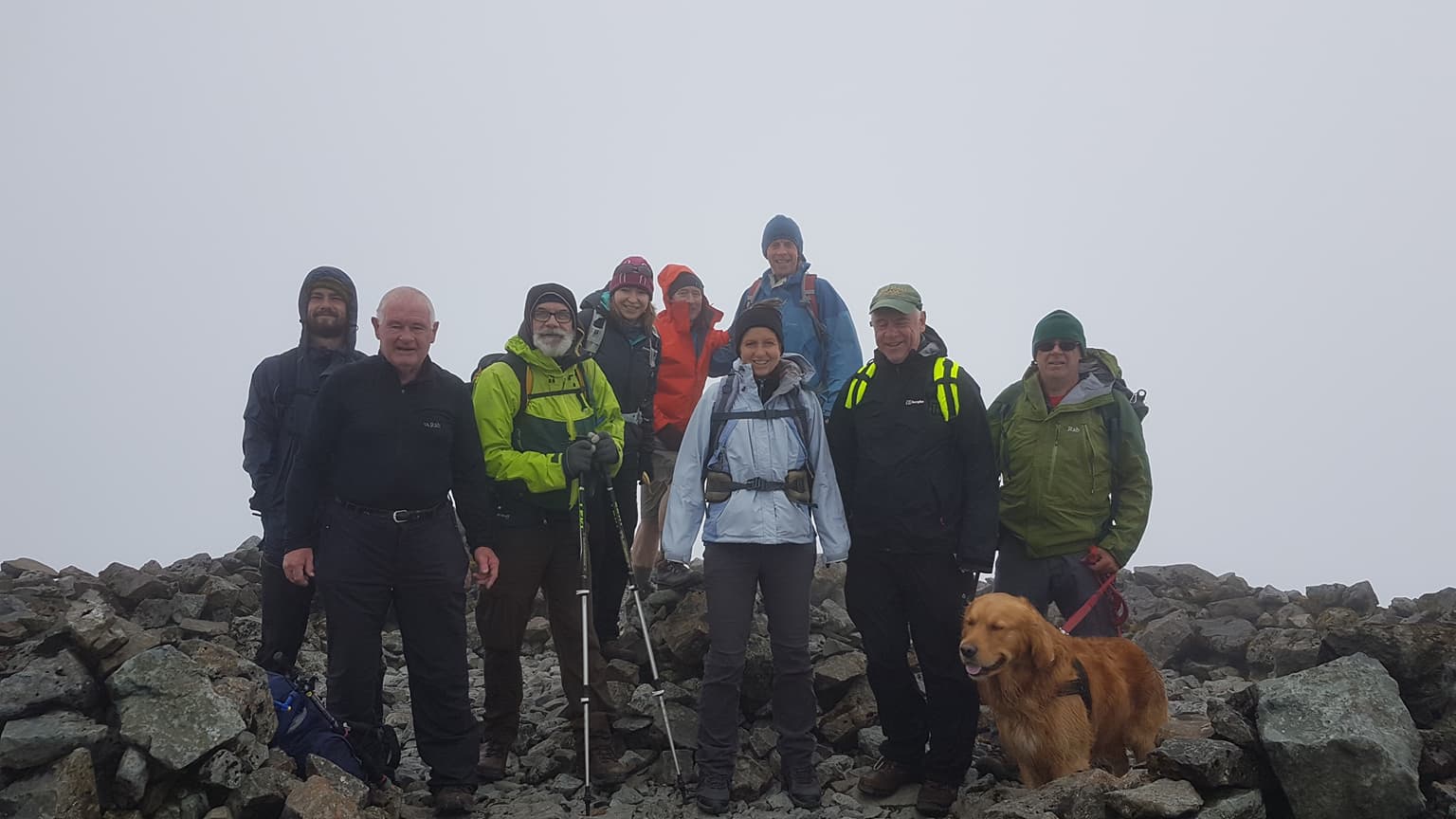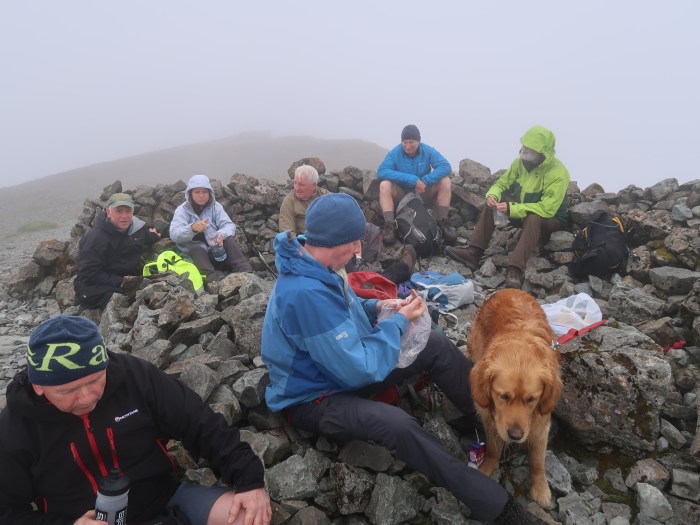 Sure enough the clag descended with a couple of hundred metres of ascent ahead. Not only that but the temperature dropped considerable and gloves were donned by those pessimistic enough to have packed them. Dixie’s tasteful denim shorts would have been perfect for the beach in Ibiza but can’t have been too comfortable in the dank and chilly conditions.