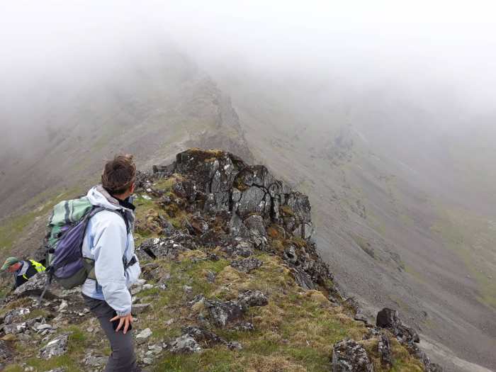 Just enough time was spent on the summit to refuel and take some misty photos before the party split. Susan, George, Jim, Jordan and Mike headed North West to descend over the A Chioch ridge and return over the Graham of Beinn Fhada’s long ridge. Somewhere in the back of George’s mind was an additional ascent of a Relative – but that’s exactly where it stayed, their return being complicated by the requirement for some careful route-finding along the craggy ridge in the mist.