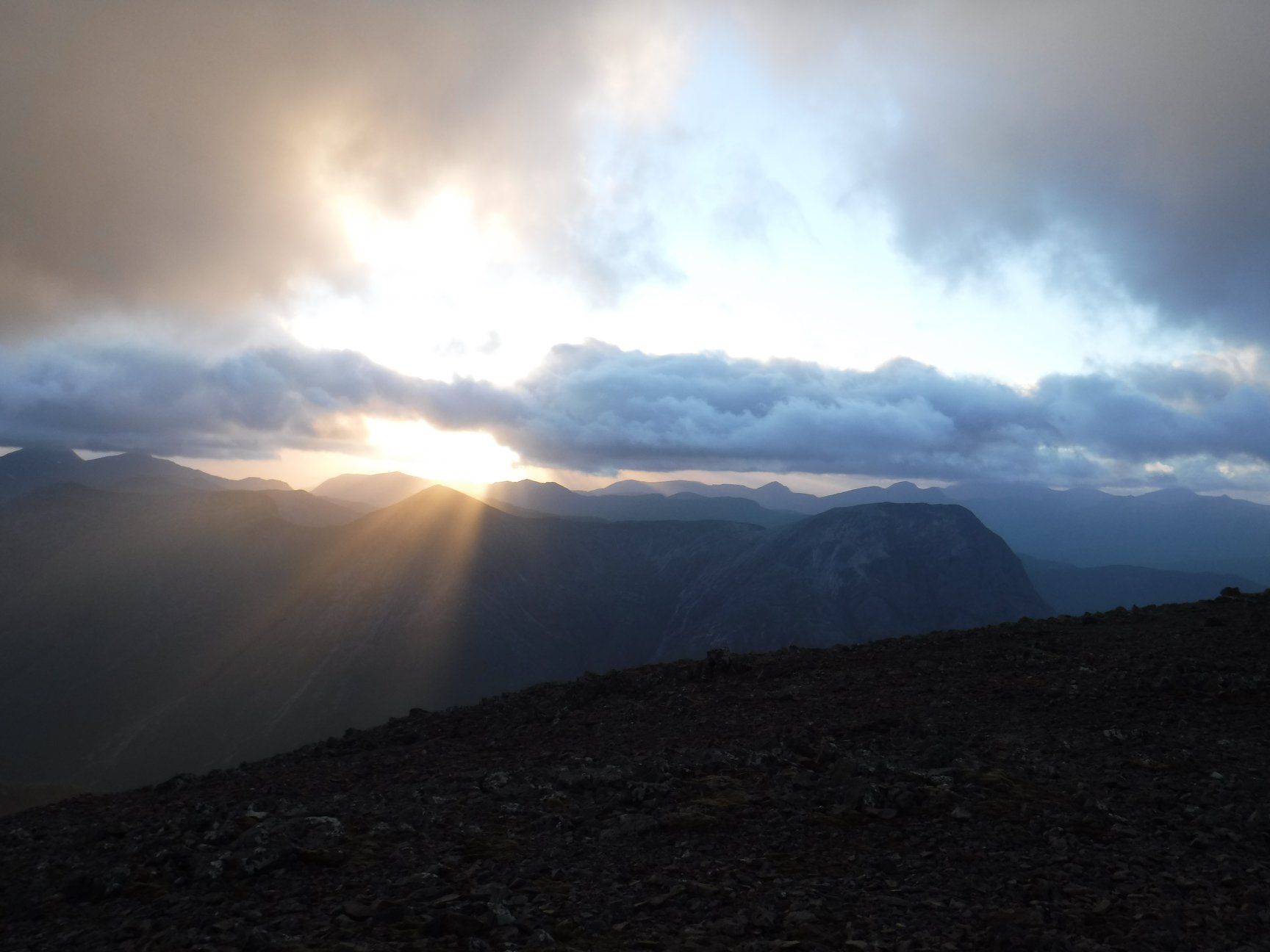 With the approach of the summer solstice George and Susan set of in their campervan and headed up to Glencoe on Thursday evening. They planned to take advantage of (nearly) the longest day with an evening climb up the two Munros of Creise and Meall a Bhuirdh which tower over the Glencoe Ski Centre. There is no photographic evidence to suggest that George climbed the hills barefoot and bedecked with a flower crown as a nod to the pagan significance of the day. There were some photos though capturing the stunning summit views in the dying light.
