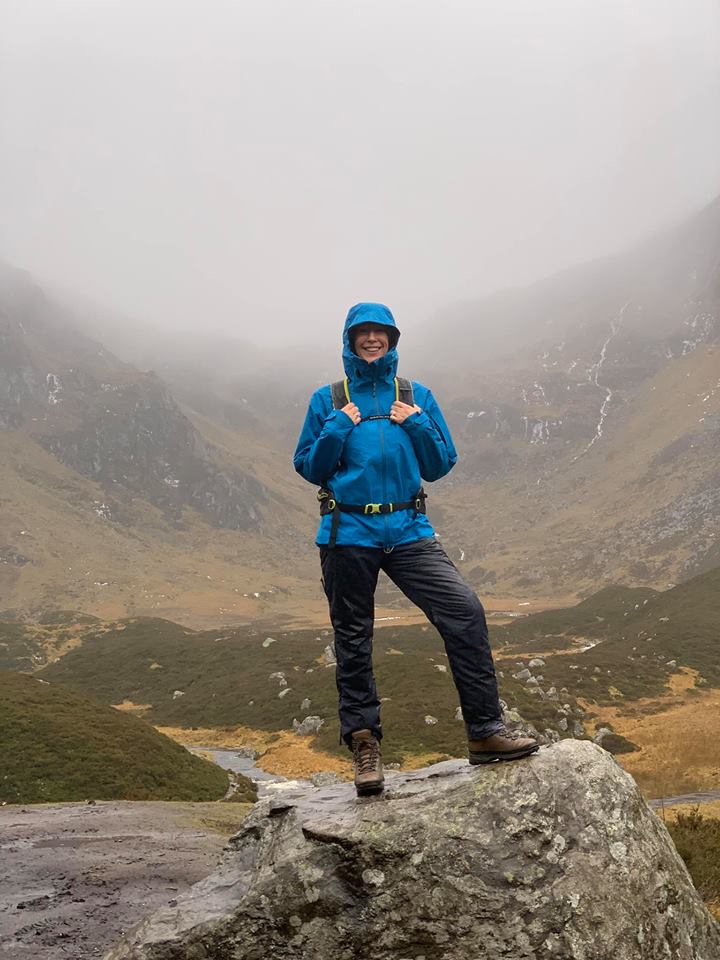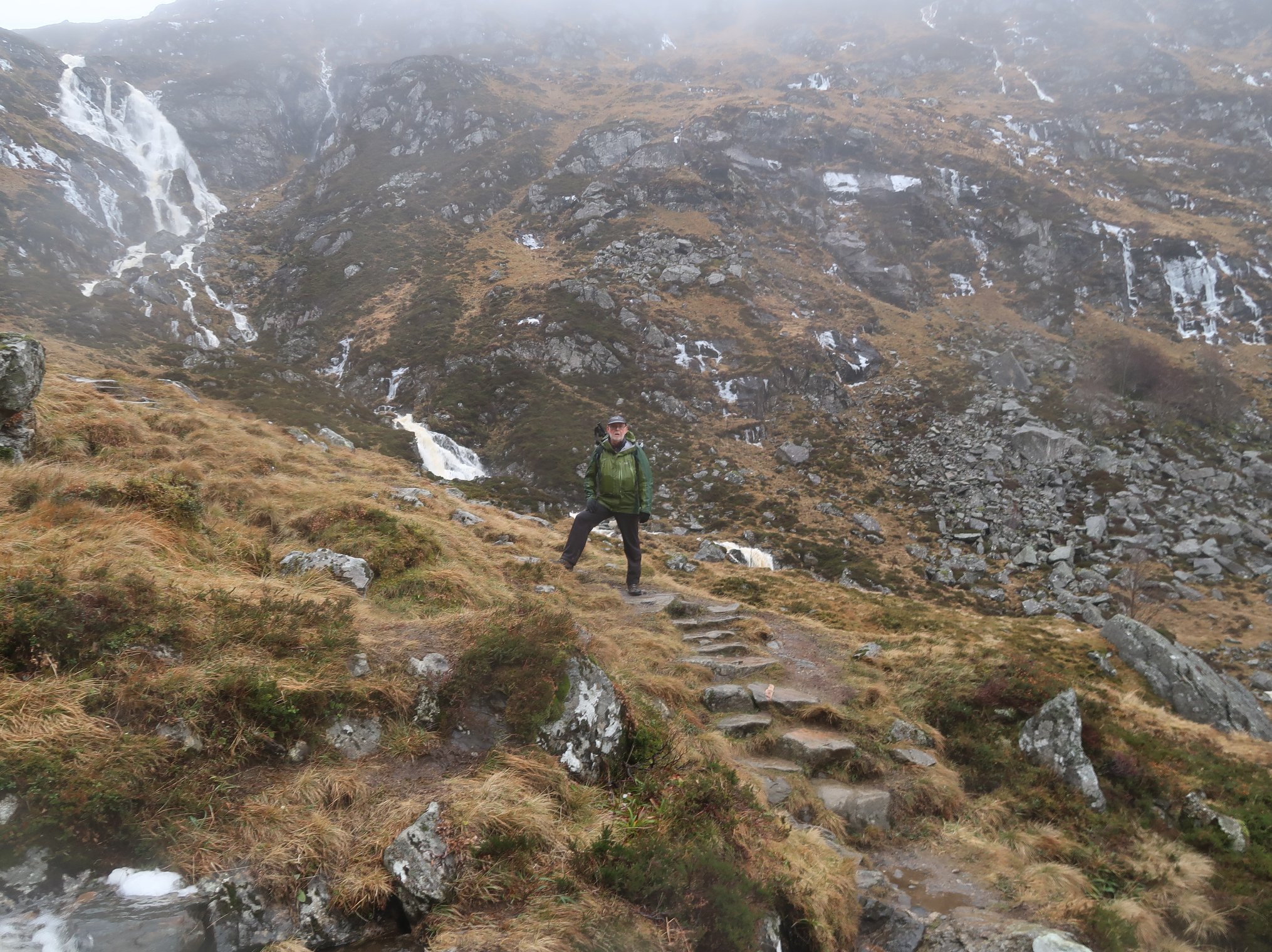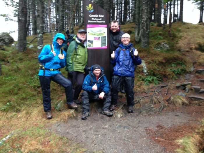 Jim, Stuart, Donna, Ian, Alan and Norrie undertook a leg-stretcher through the forest tracks up to the magnificent Corrie Fee – a spectacular viewpoint in good weather but still gloriously atmospheric in the mist and rain. As the others returned from the entrance to the corrie for tattie peeling duties, Alan and Norrie continued up the track towards the impressive waterfalls of the Fee Burn tumbling down the rocky headwall.