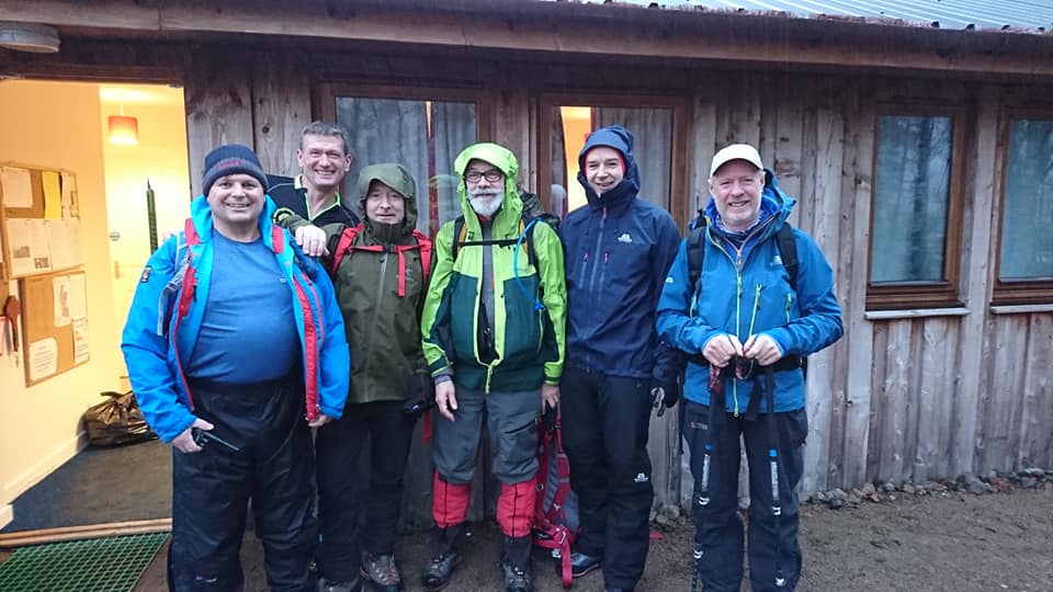 In the meantime, the Fearless Five (not including the infiltrator in the photo below) consisting of John, Alyn, James. Jim and Gerry had taken a direct bearing for The Scorrie, an unrelenting steep ridge which rises above Winter Corrie (scarcely living up to is name) before leading up to the Munro summit and Trig Point of Driesh. The “Dreich” comparisons were well earned as they enjoyed a coorie-doon in the shelter cairn to take on some refreshment before heading east over the Kilbo Path to the Munro’s next door neighbour Mayar at 928 metres, slightly lower. From there they aimed north to the headwall of Corrie Fee where a steep descent down the well-made path took them down below the worst of the weather and an easy tramp back to the hut.