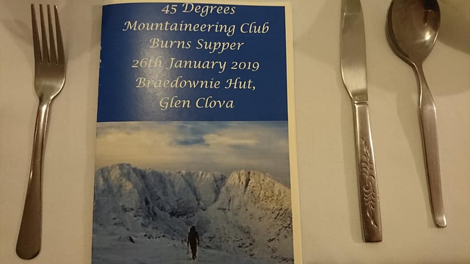 Back in February 2016 the Club visited the Glen Clova hut owned by Dundee’s Carn Dearg Mountaineering Club. We had hoped at the time to be one of the first clubs to visit their brand spanking new hut, but unfortunately red tape got in the way of the new hut’s opening and our meet was held their old hut one hundred yards away. Nevertheless, a great weekend was enjoyed. This time round though we would definitely be spending the weekend in the relative luxury of the purpose-built accommodation which had been selected as the venue for the Club’s annual Burns supper meet.