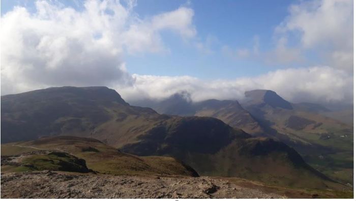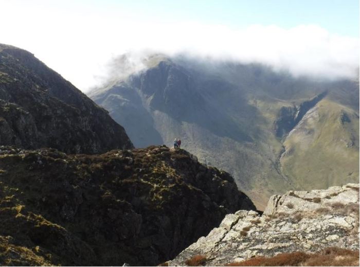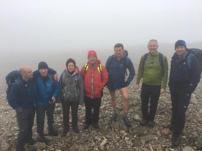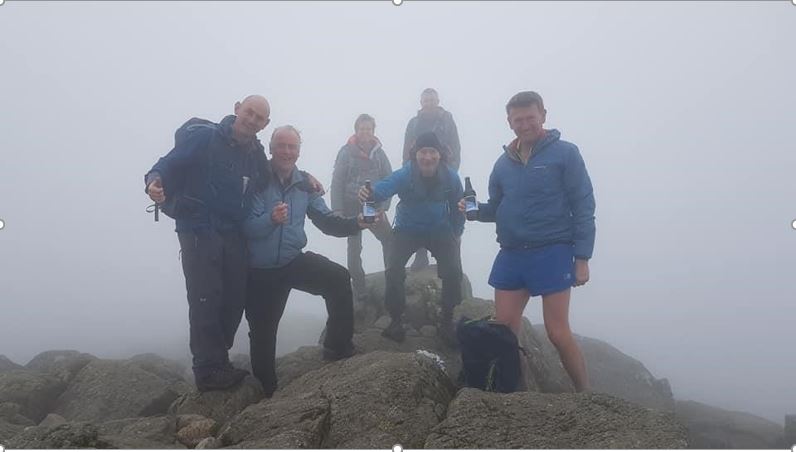 Saturday’s forecast wasn’t so promising and Adrian and Ania set off for Keswick. George had created a convoluted route to bag the most Wainwrights for the least effort and accompanied by Susan, Raymond, Jim, Bill, Brian and Jason set off for the Honister Pass for the start of an unconventional walk over Fleetwith Pike, Grey Crags, Brandreth, Kirk Fell, Great Gable, Green Gable and Base Brown. They were led unerringly round the hills in the mist by Lakeland expert Jason, and it was only after the summit of Great Gable where they met up with the other party that views began to open up. The other party of Pete, Mike, Marie, Ian and Andy had set off from Seathwaite and had come over Green Gable to Great Gable. As Jim played the bagpipes on his phone at the summit, and Raymond produced 2 Refreshing Beers for the Mountaineer, Marie, in the mist and ahead of her group, thought she was hallucinating and was glad to see on meeting us that she wasn’t being laid to rest in Greenock!