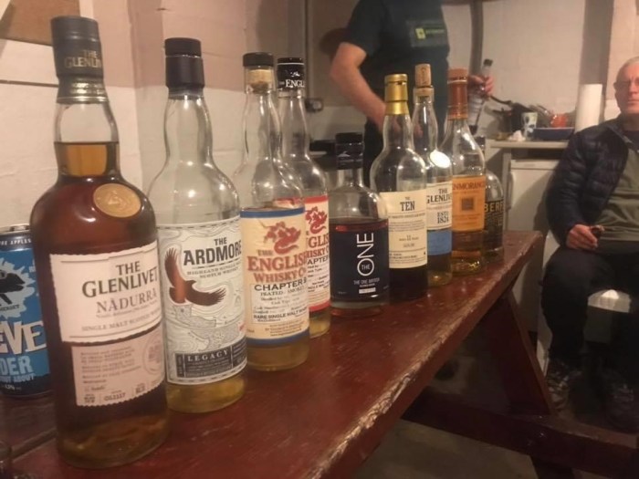 Saturday night saw Adrian and Ania depart for Glasgow. 3 nights of Hell being enough for any sane hillwalker. Unfortunately, Marie departed early for bed feeling ill, leaving only the hardened crew ready for a whisky tasting to test their mettle. The blind tasting was of 4 whiskies with the only clue given being that at least one was made in England. Would the Scots be able to detect the impostor(s)? As there had already been a bit of drink partaken, the various descriptions of colour, nose and taste would have made Jim Murray of the Whisky Bible blush! The first bottle started promisingly with the colour described as ‘end of Autumn barley’. This was quickly put in its place by Raymond’s reference to the colour of his p_sh up the hill. The taste had a few comments of Islay and West Coast, but was actually a bottle of Ardmore, a Scottish malt from Highland region.