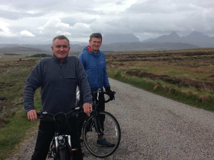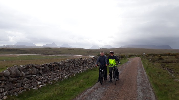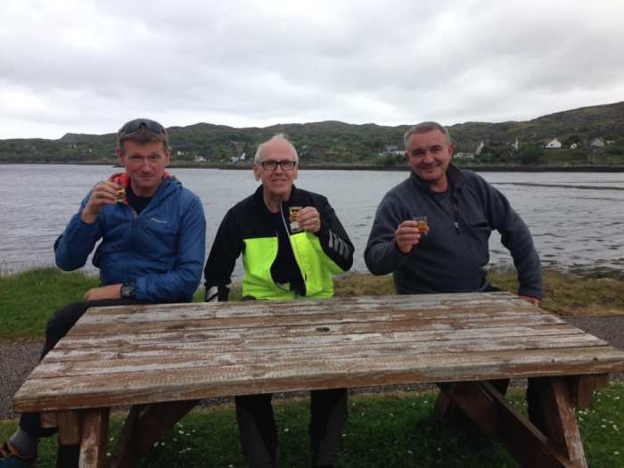 If the area is great for hillwalkers, then it is equally enjoyable for cyclists with miles of single track road and superb coastal views. Jim and Raymond accompanied Paul on his electric bike for a tour of the area, heading out towards the Summer Isles which sit just off the Coigach peninsula. Time out was taken to celebrate Jim’s birthday. Unfortunately, they could not afford a whisky as old as him.