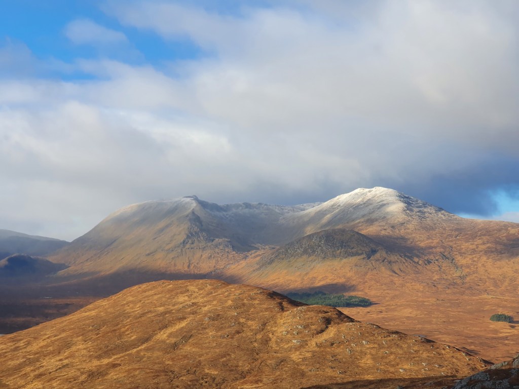No snow for Raymond and Lorn on Meall Mor at Rannoch Moor, but excellent views to nearby snow-capped peaks, particularly to the South and West, and over Lochan na h-Achlaise.