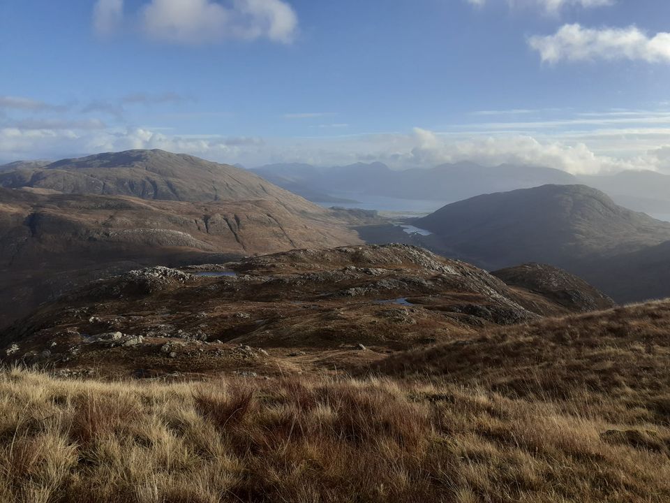 Today was always expected to be a much better day so, while some headed home, Adrian and Ania followed in Wallace and Alyn’s tyre tracks from the day before, though not their bootprints, and scaled Spidean Mialach and Gleouriach on the opposite side of Loch Quoich from Gairich. By this time, there was a good deal more snow on the tops and a definite wintry feel.