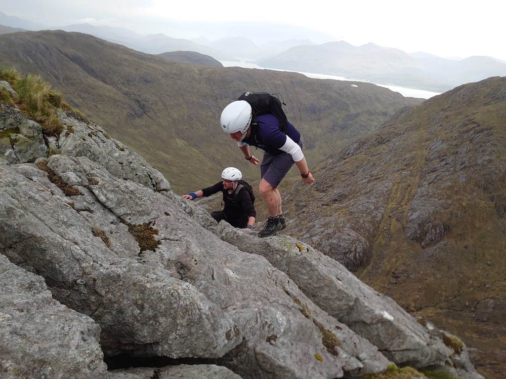 With the weather too good to be going straight home, John, Paddy and Lorn made a late call to head for Garbh Bheinn, via Pinnacle Ridge. As it was wholly unplanned, the latter pair didn’t have a climbing helmet with them so, donned their aero cycling helmets and, being with lucky charm JC, were delighted not to have bumped into anyone on the hill with these on!