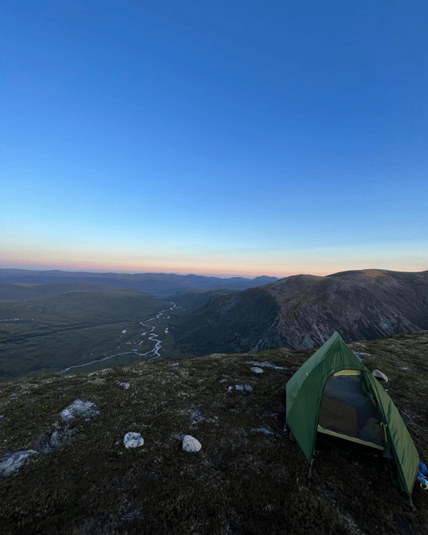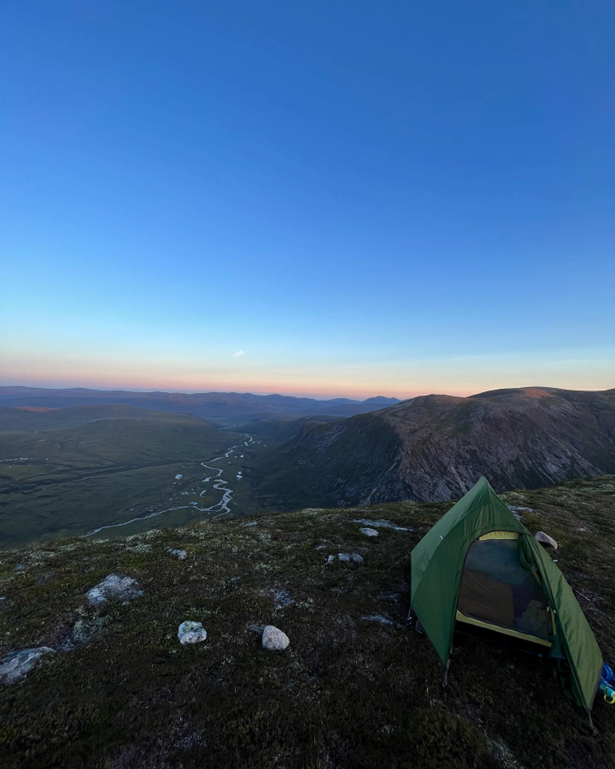 First to arrive on Friday was Louise, but she was a Miss on a mission with some mighty big fish to fry. Shortly after parking her car, she headed up to the Lairig Ghru with her tent and overnight gear in her pack intent on a high camp. First though she was to traverse the high Cairngorm summits of Braeriach, Sgòr an Lochain Uaine, Cairn Toul and finally the Devil’s Point where the tent was pitched close to the summit. These four Munros took her to within a couple of the halfway point in her round.