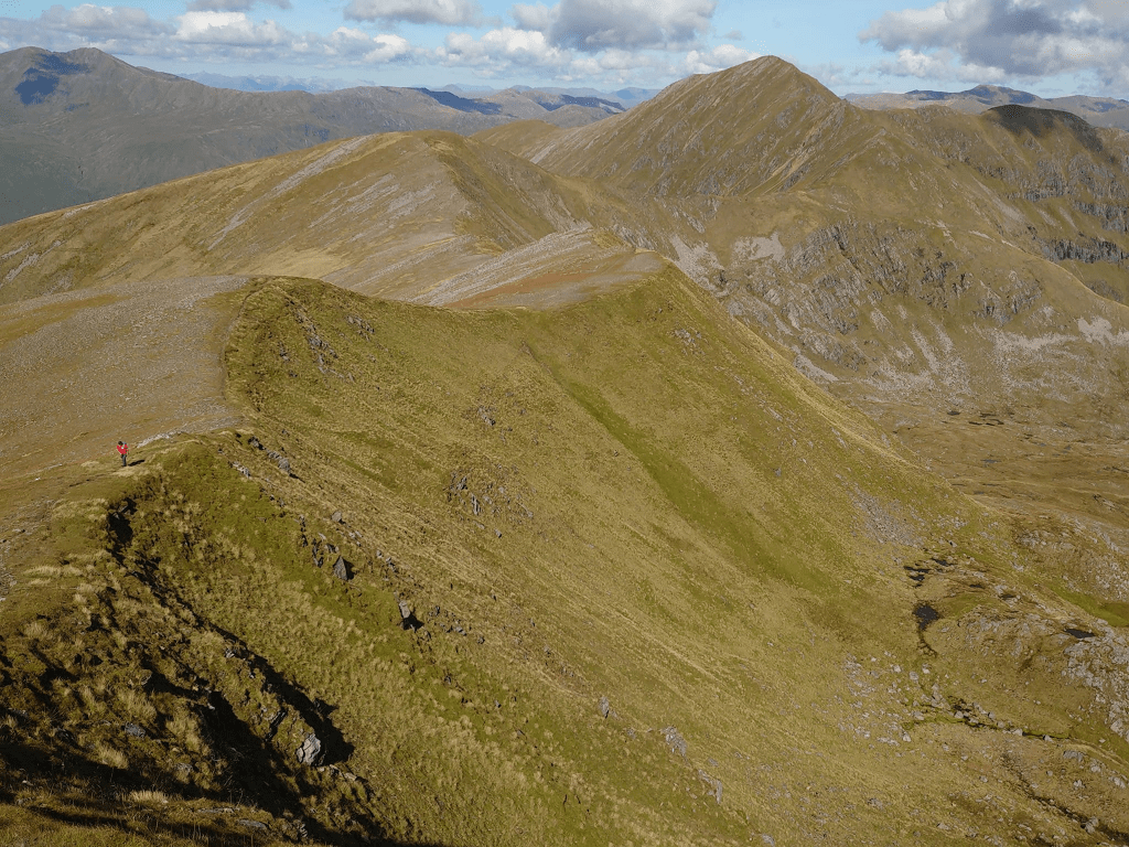 Just back from a brilliant weekend away in beautiful Glen Affric wae the guid folk fae the 45. Yesterday Alyn, Fraz and me had a tough auld outing on Mullach Fraoch Choire and A’ Chralaig. The closeness of these two fine mountains to the hut in which we were staying flatters to deceive. Reaching the Mullach’s NE ridge involved a long approach negotiating much boggy ground, peat hags, long tussocky grass and four deer fences. As height was gained the day developed into a fantastic ridge walk with stunning views in every direction. From A’ Chralaig we descended via the Munro top, A’ Chioch, down into Gleann na Ciche to end a fantastic mountain day. Alyn got two new Munro ticks (and a top), Fraz and me bagged a new Munro top each. I’d like to thank Bill and Adrian for ferrying us and our kit along the rough estate track to the hut and back. This saved us a 10 mile round trip on foot. Cheers boys.