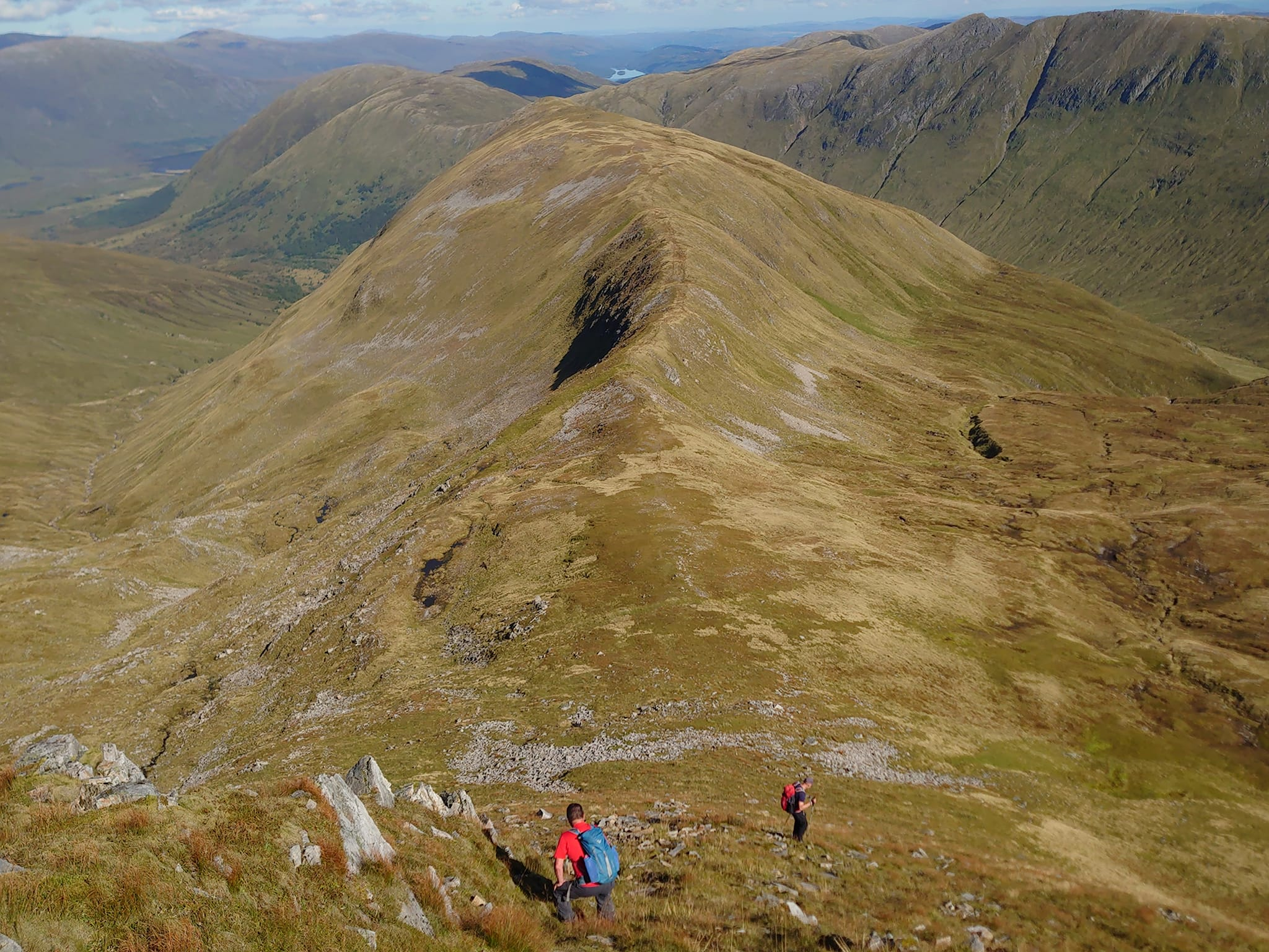 At the car park we were soon joined by Joak and Alyn and after a brief confab decided to leave Alyn and the gear to be picked up in Bills van while we walked in. We were picked up towards the end of the track and with Ania and Adrian in tow the party was complete. Usual Friday night then up bright eyed and bush tailed for two Munros and a Munro top as described in Joaks earlier post. Steep ascents and descents but the toil and sweat was rewarded with the all round vistas, the clarity of the air being very good. All arrived back safely from their outings and although some were a bit fatigued by the exertions, heat and pace of their day we managed songs and tall tales into the wee small hours with the last thing active being a rather large bat flying around the attic bunk space.