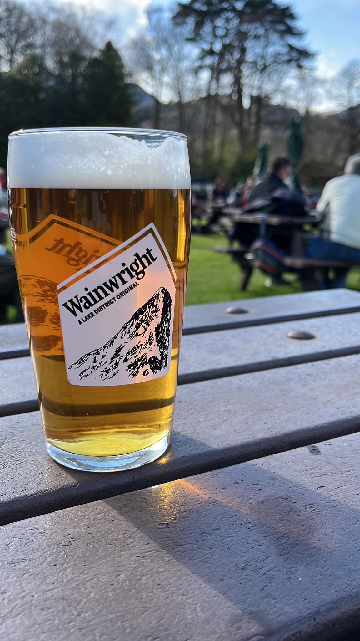 Thanks to Mike P picking up George & Susan from the base of Hartsop Dodd and Mike L sweeping up the rest there a short time later (Mikes’ Taxis, the best taxi firm in the Lakes!), EVERYONE was able to gather at The Patterdale Hotel for an appropriate refreshment on the lawn (though had to retreat indoors from the cold after an hour or so, when the sun set behind the hotel).