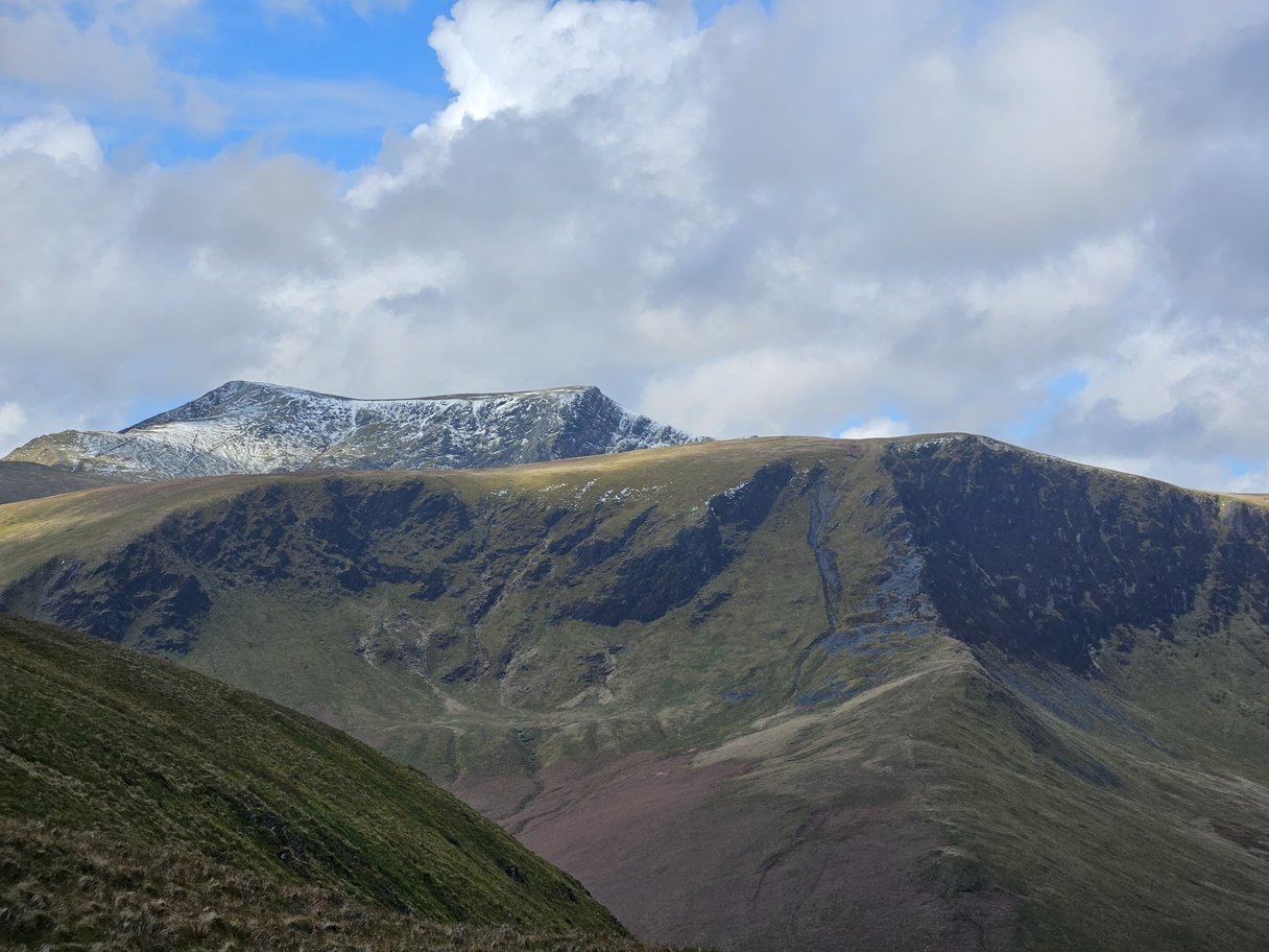 Setting off from home first thing, Angus and Lorn made good time and reached the North Lakes, in time for a quick snack at Rheged, the Discovery Centre, before a short hop to the other side of the A66 and Mungrisdale, to tackle the Round of the same name. The official start seemed unnecessarily convoluted so they took a shortcut along the edge of a field, at the other end of which they encountered a homemade sign stating that “This is not a path”…bit late! This popped them out nicely part of the way up a direct approach on Souther Fell for which, as is the case with many of the Fells, the Wainwright is a good bit down from the summit on the other side and, as usual, the large cairn to mark it offers wonderful views of most of the rest of the round, including Sharp Edge. As it had been a wet week in the Lakes, the guys opted for the straightforward approach via Scales Fell, rather than attempting Hall’s Fell Ridge or Sharp Edge, to Blencathra (the top of which was icy underfoot, as Lorn found to his cost, landing on his backside by the summit ring). Lorn had been up Blencathra previously, but the rest were new ones to them both, which was mostly a good thing, apart from the next one, where neither of them had encountered a wetter “hill” than Mungrisdale Common. It didn’t “look” too bad but, beneath the multi-coloured grasses lay water trap after water trap and they could not get out of there quickly enough in the end. Fortunately, Bannerdale Crags and Bowscale Fell restored their faith but that would soon be tested again, as they could see one of the forecast heavy showers fast approaching (possibly the same one that had done for George on Place Fell). After a quick glance at the impressive view to Bowscale Tarn, they raced against time to get to off the long ridge from Bowscale Fell and into the warm bosom of the Mungrisdale Inn, making it with seconds to spare before the heavens opened with a mixture of heavy hail/sleet. After a refreshment, the shower had pushed on through and they had a short walk in the sun to the car and a short drive to hook up with the others in Patterdale.