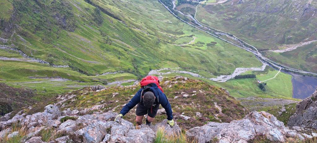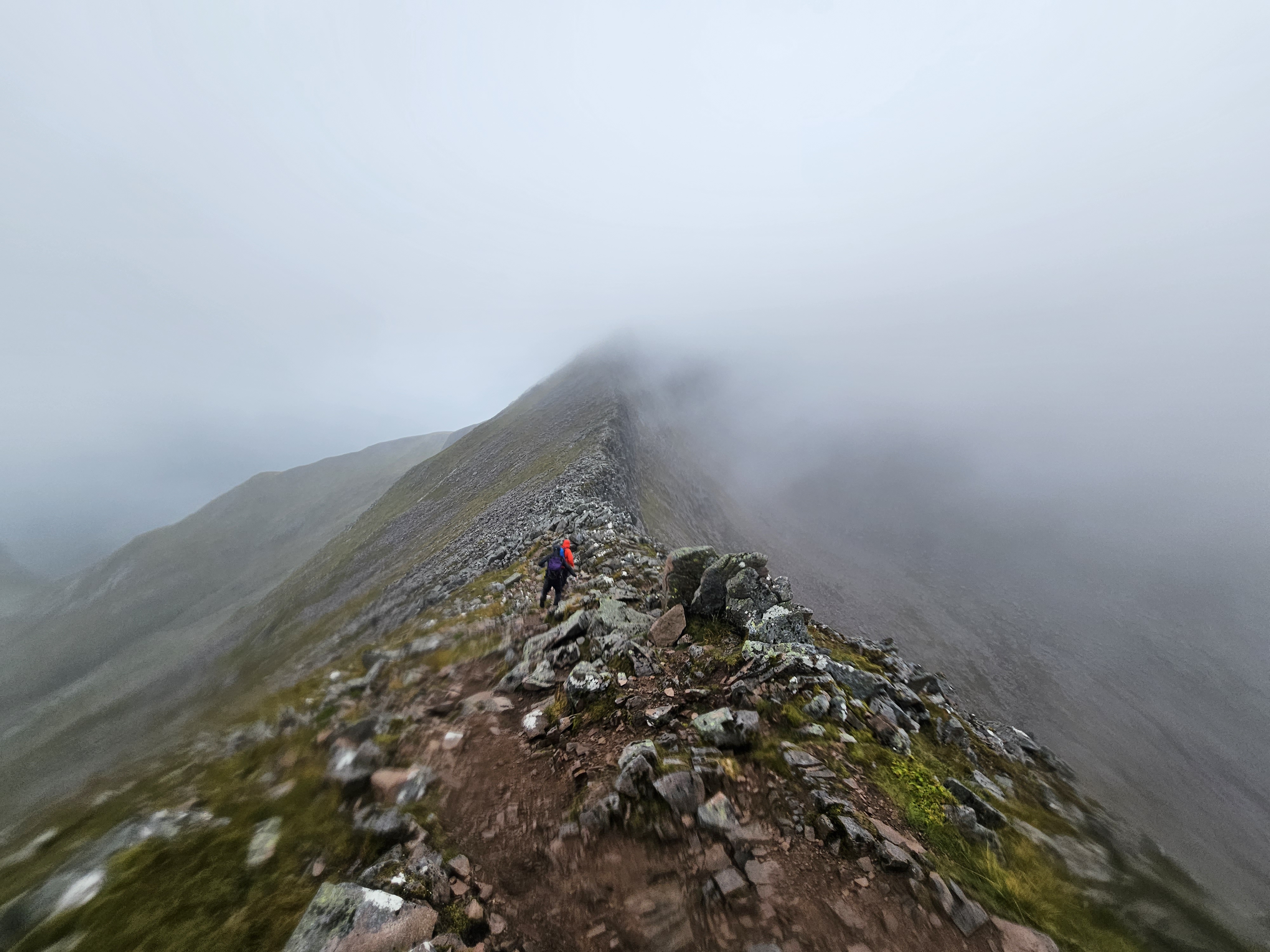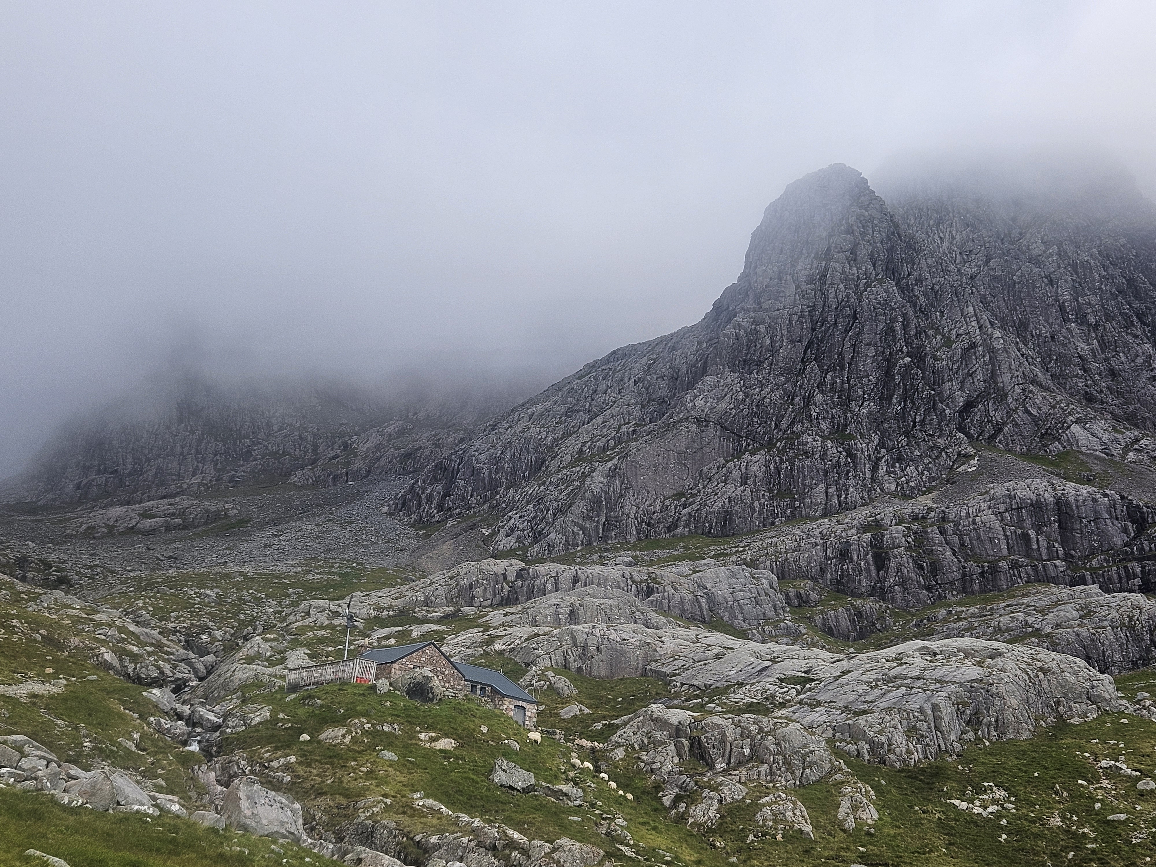 The others decided to continue in the opposite direction and see how things were on the CMD Arête, moving carefully over the very wet ridge and made it across the arête, the wind picking up again just as they headed up on to the Ben from the abseil point. They’d only seen three other people to this point and the summit of Ben Nevis had fewer than two dozen folk milling around in the clag, most of them queueing for a summit photo. After a quick photo by the summit hut, they headed down and between there and the halfway lochan, passed literally hundreds of ill-equipped walkers, none of whom appeared to be enjoying themselves. The only smiles they saw on the way down were from the MRT folk they’d met earlier, who’d just topped-out from Ledge Route heading to the summit and fully expecting to be called into action, given the conditions and the condition of some of the path users.