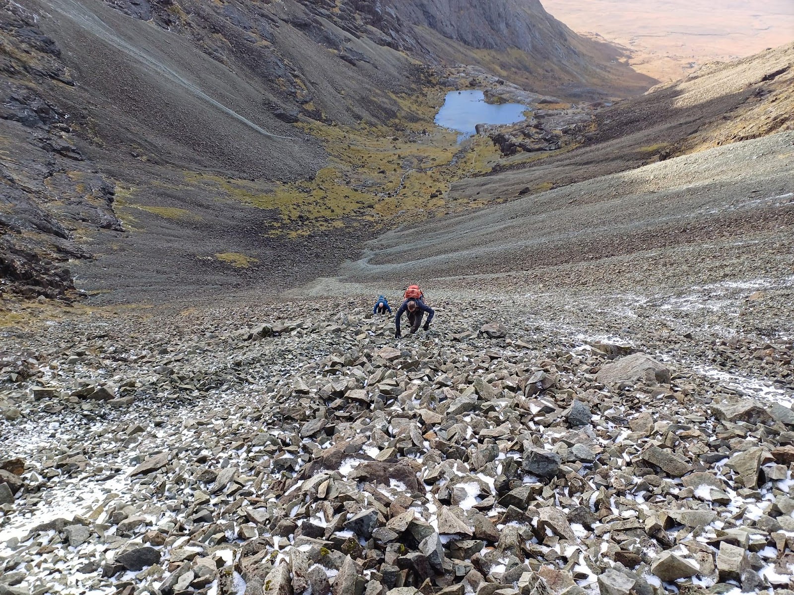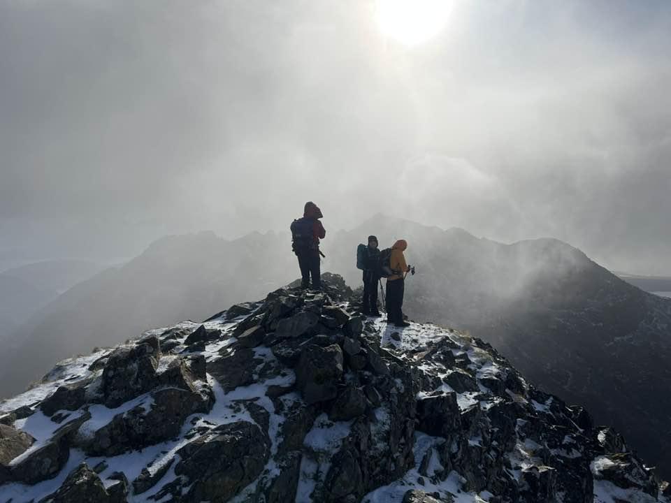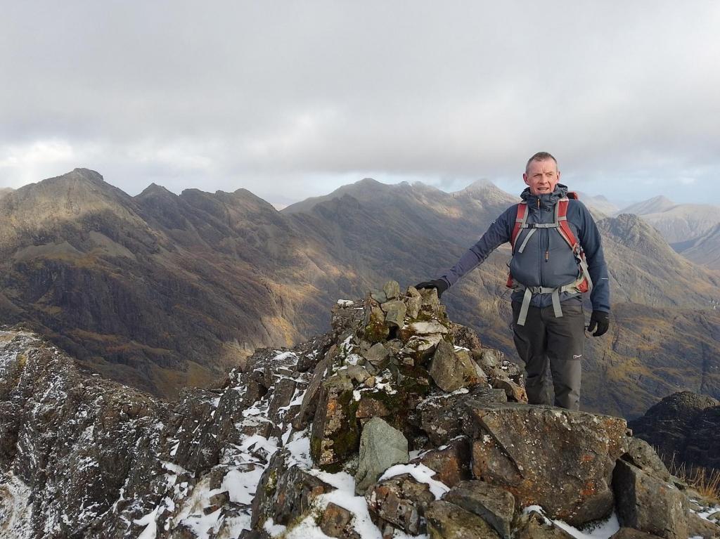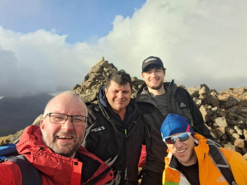 The 5-a-side team of Linda, Angus, Paddy, Ewan and Mike P had the same objective and their route started with a march up the road to the Youth Hostel. There followed a fine walk past the burn tumbling down Coire a Ghreadaidh before turning west into Coire an Eich and a relatively easy scramble up onto Sgurr na Banachdich. Job done, they returned via the ascent route.