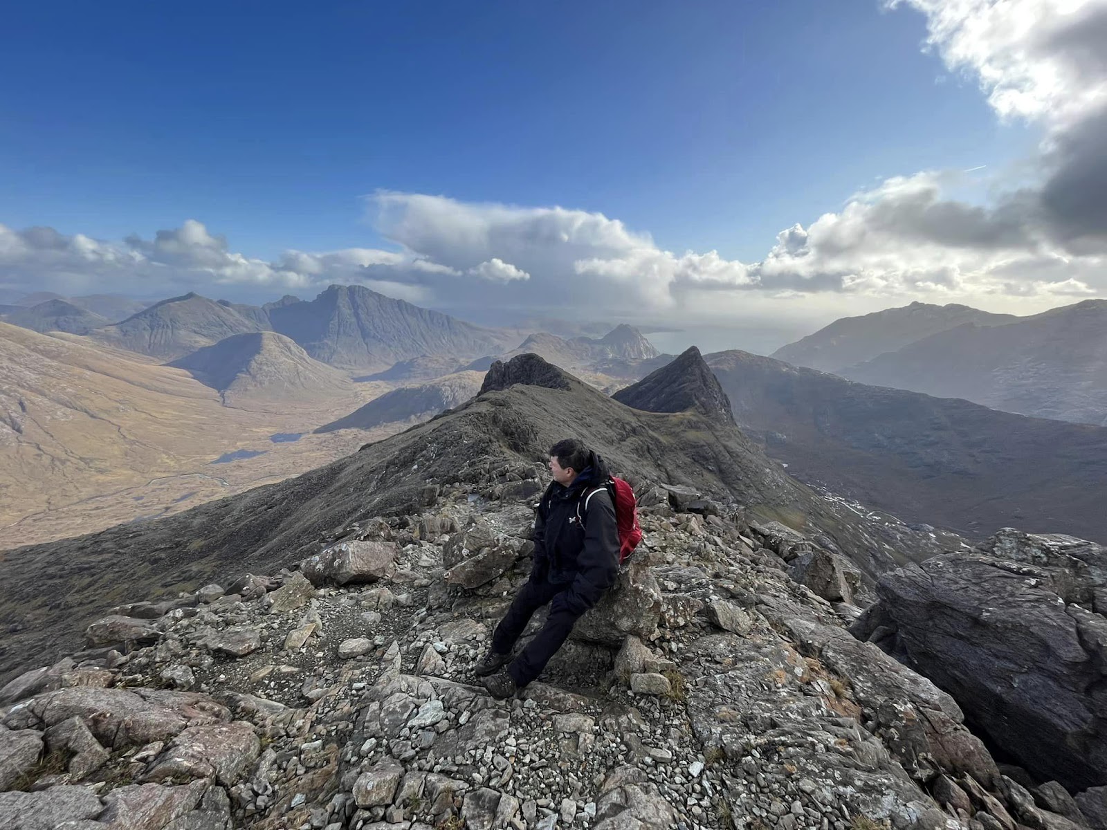 George and Susan kept their powder dry(ish) with a stroll up the sub2000 Beinn a’ Bhraghad on the west side of Glen Brittle. The reward for their efforts was a stupendous view over to the main ridge. George may have intoned “far on a horizon, I see the rocking of the antlered Cuillin”, though most sources would credit Sorley Maclean.