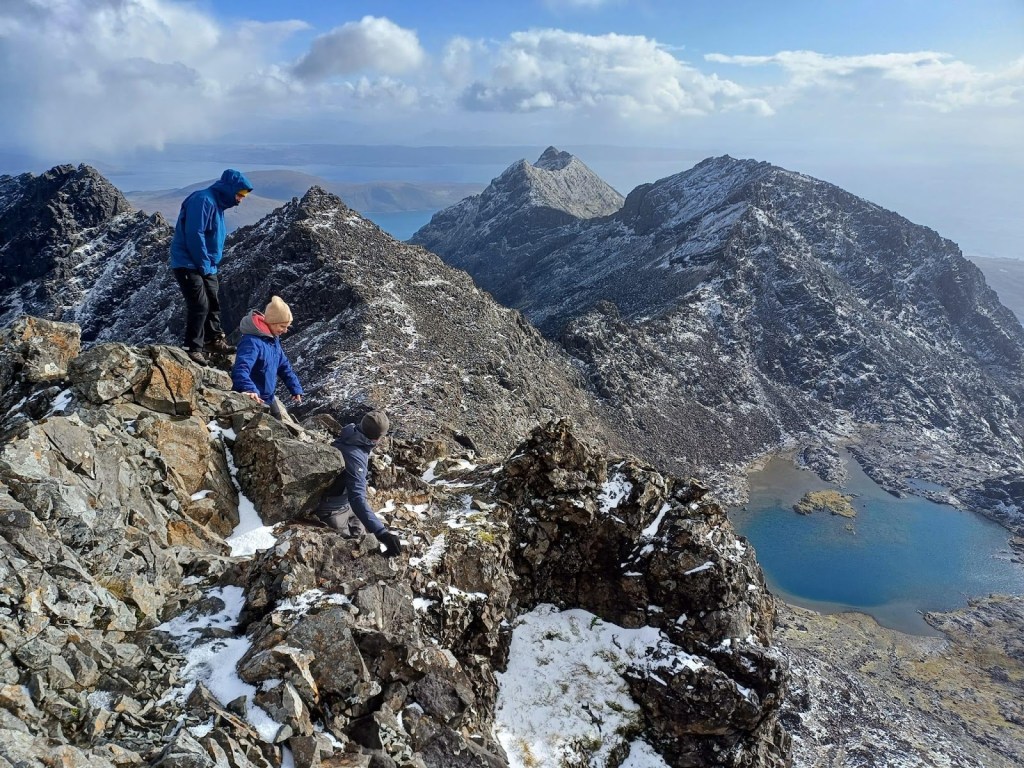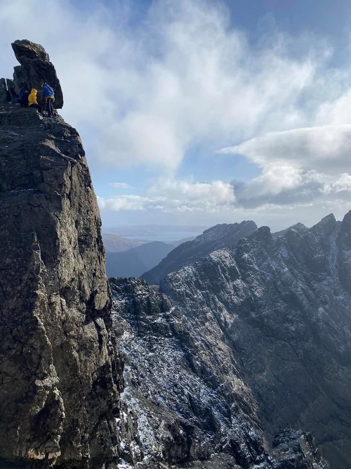 Bill and Louise M also set off to bag Sgurr na Banachdich, but their approach took them up round the foot of the Inn Pin where a guide and his client were negotiating the “improbable tower”. From there they scooted along the ridge to their target Munro where Louise safely doubled her Skye tally enjoying (or not) sunshine and snow showers.