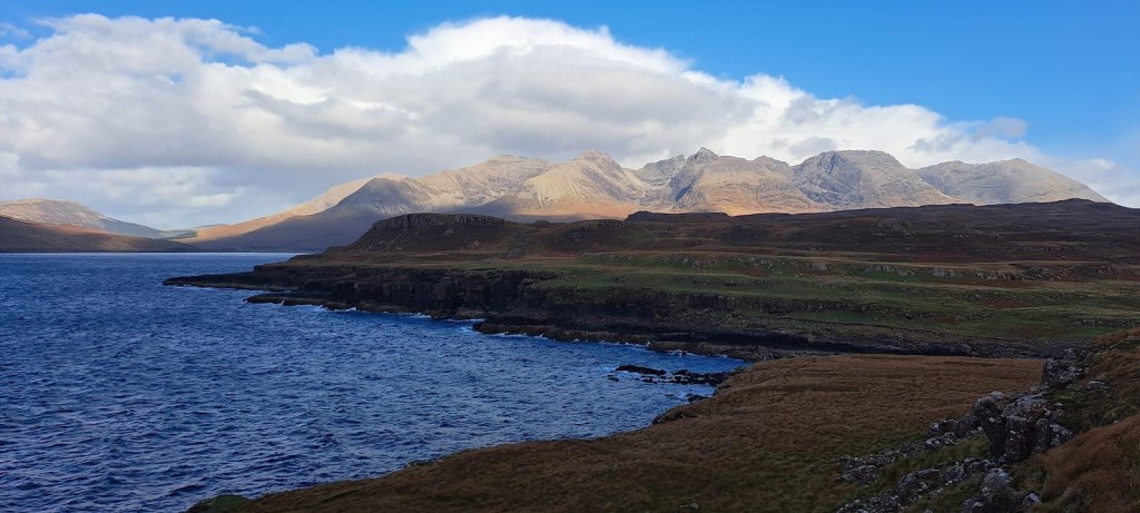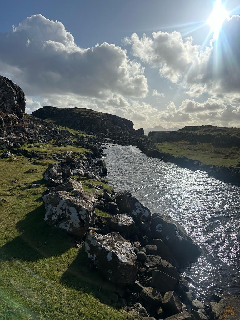 Raymond had a knee issue so wasn’t able to get himself up onto the ridge. Accompanied by Alan though, they had a hugely enjoyable 15k walk out the Rubha an Dùnain, a peninsula stretching out from the beach at Glen Brittle. As well as affording superb views of the Cuillin ridge (and the Rum Cuillin as well) the area is steeped in history. There are ruins, chambered cairns and a canal dug out by Vikings enabling a shipyard in the loch. They even managed to find the bridge over the surging burn that caused a group ahead of them to retreat!