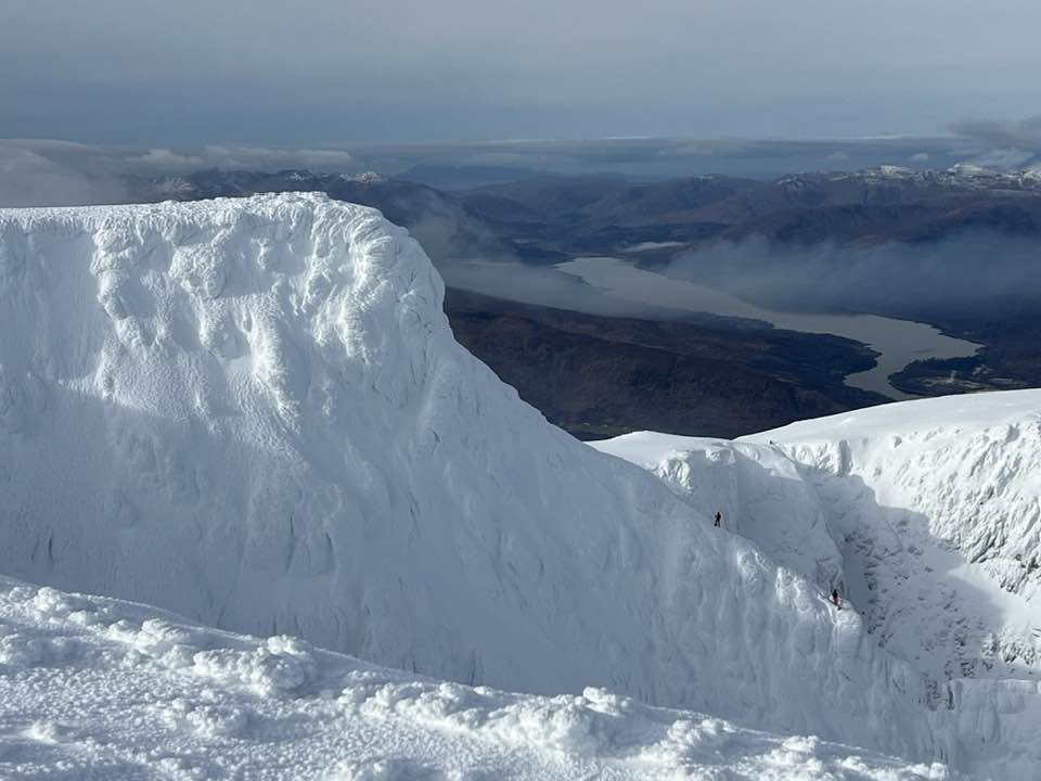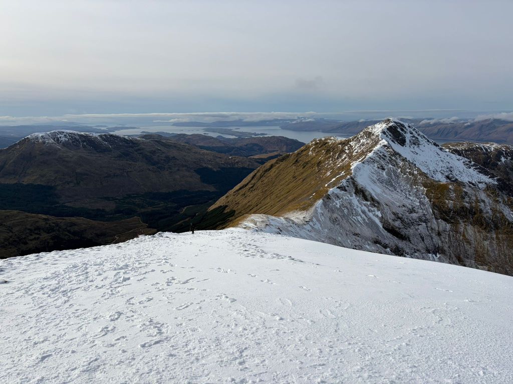 Ahead of the game were Bill and Hazel, also planning on ascending the mighty Ben, but by way of Carn Mor Dearg and the adjoining arete. This is a classic scramble in summer conditions but takes on a different character in winter. Ice axes and crampons were an absolute necessity and the pair crunched and hacked their way up the narrow icy slope to the summit.