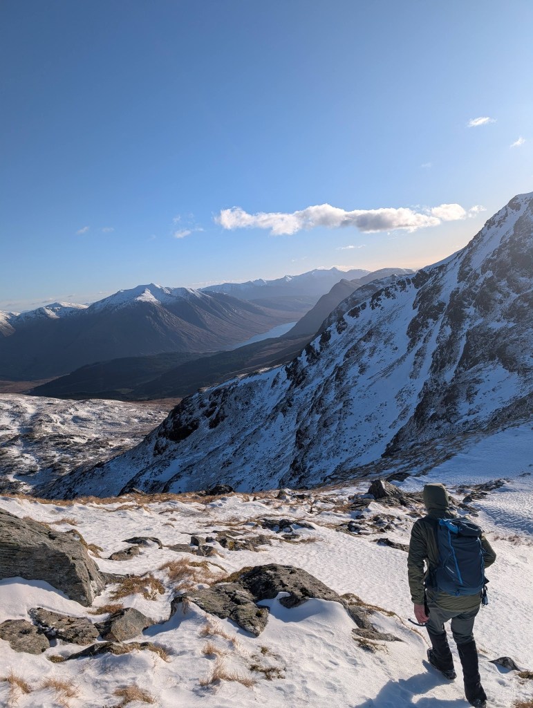 The shapely Beinn a’ Bheithir pair of Sgòrr Dhearg and Sgòrr Dhònuill are well seen from the hut and Angus and Stephen drove the short distance to claim this illustrious duo. For Stephen this was his first venture onto winter mountains wearing crampons – and he is now an enthusiastic convert having enjoyed the experience hugely.