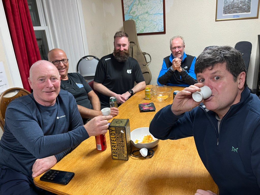 Guitars remained cased for the night but there was no shortage of tales (new and re-hashed), banter and laughter during the evening. The lack of drinking vessels required some imaginative solutions with milk jugs for wine and – yes, egg cups for whisky which held a 30 ml dram. The Glen Bylteigh tasted just the same. A decent contribution was made to the glass and can recycling before the evening drew to a close.