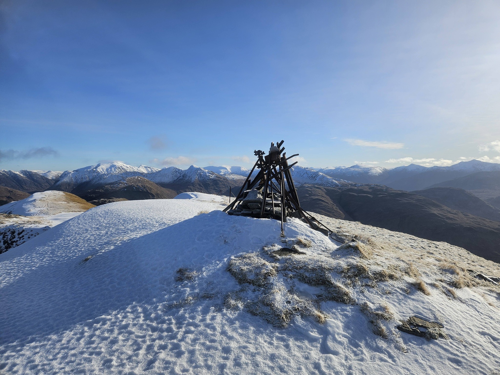 So it was that Stumpy and Stumpier (aka George and Norrie) headed for a wee 10k saunter up to the Dùn Deardail fort, Glen Nevis, a spectacular hilltop viewpoint with an icy Ben Nevis rising gracefully yet perilously on the other side of the glen. At one point they thought they heard Mike Partington peching his way up, but just maybe it was the dog they heard barking later on.