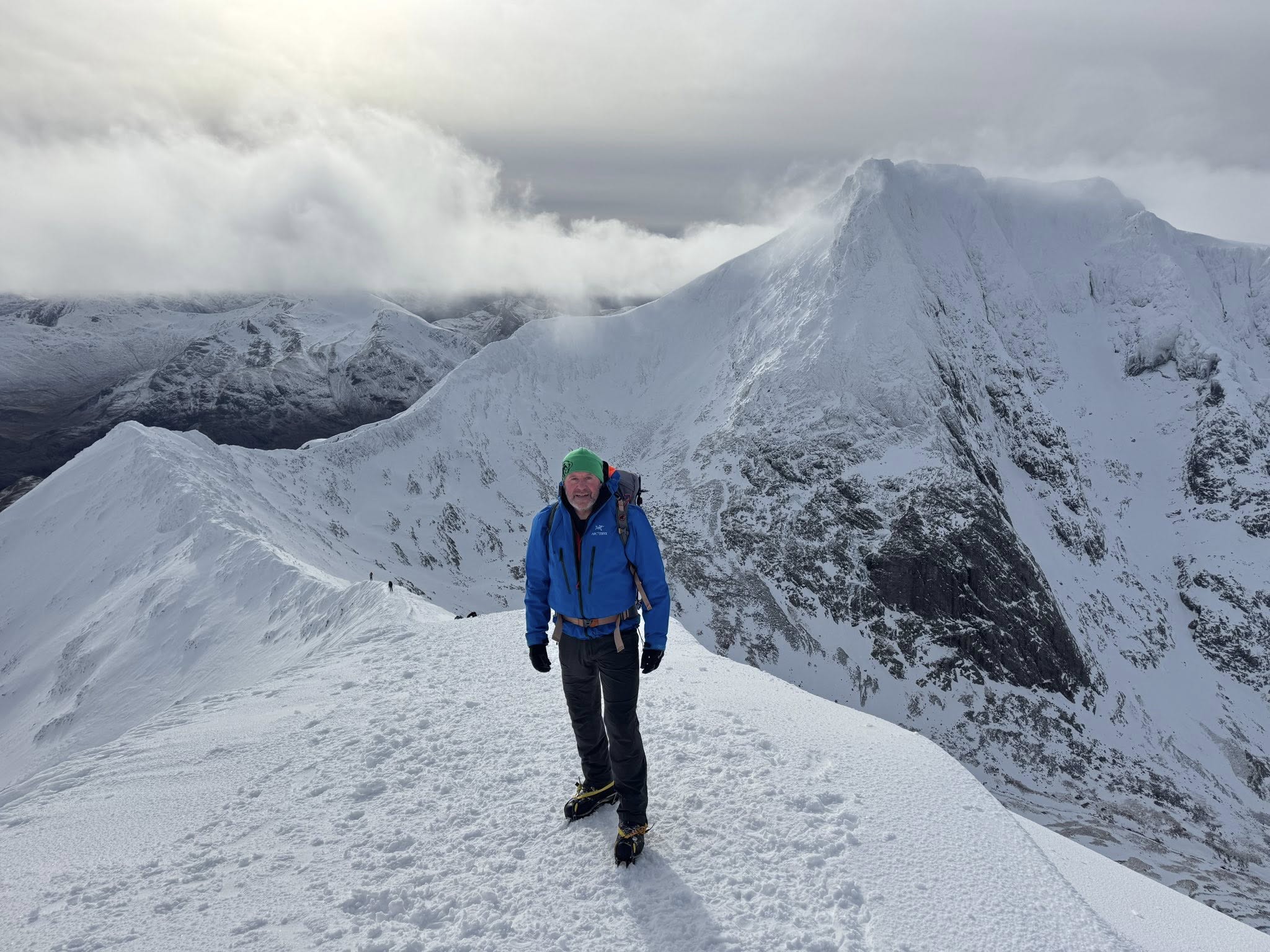 Mike had the Ben in his sights and was content to tackle it via the “tourist route” . He had ascended Britain’s highest mountain several times previously, but views from the top had eluded him. Surely this time would be different! Some clag was whirling around when he reached the top, but the outlook was breathtaking, especially over towards Tower Ridge which some hardy souls were ascending.