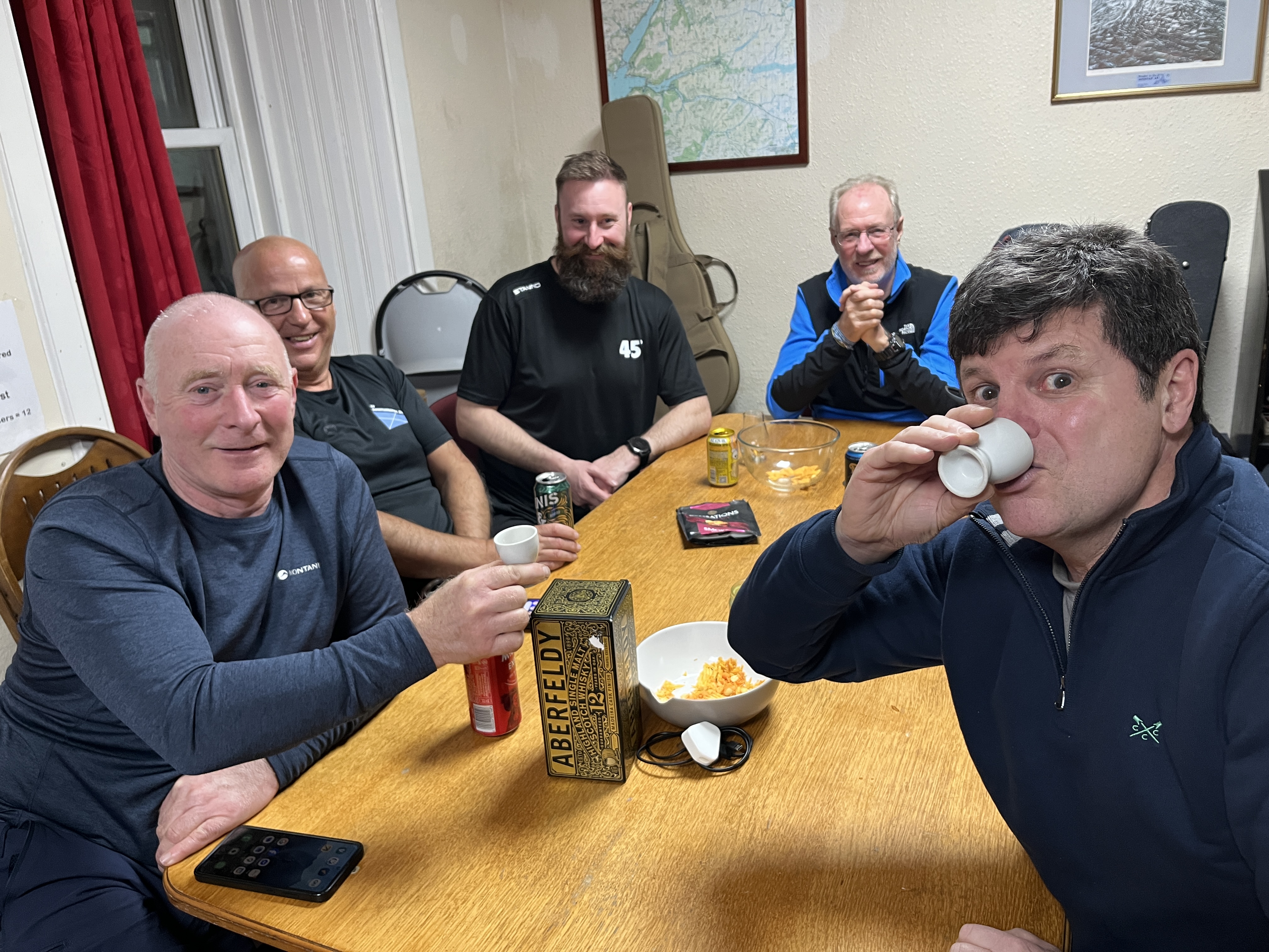 Guitars remained cased for the night but there was no shortage of tales (new and re-hashed), banter and laughter during the evening. The lack of drinking vessels required some imaginative solutions with milk jugs for wine and – yes, egg cups for whisky which held a 30 ml dram. The Glen Bylteigh tasted just the same. A decent contribution was made to the glass and can recycling before the evening drew to a close.